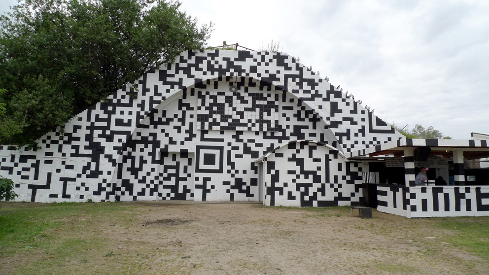 210 klappen is a wall of 210 revolving panels arranged in a 21x10 pixel matrix. Each flap has a black front and white flipside. By turning the 22 x 22 cm pixels,one-by-one patterns, bitmaps and animations can be shown just like on vintage electronic displays. Each mechanical Pixel is driven by a small motor inside the panel and can be set to an individual angle between 0° (black) and 180° (white) within ca. 400 milli-seconds.