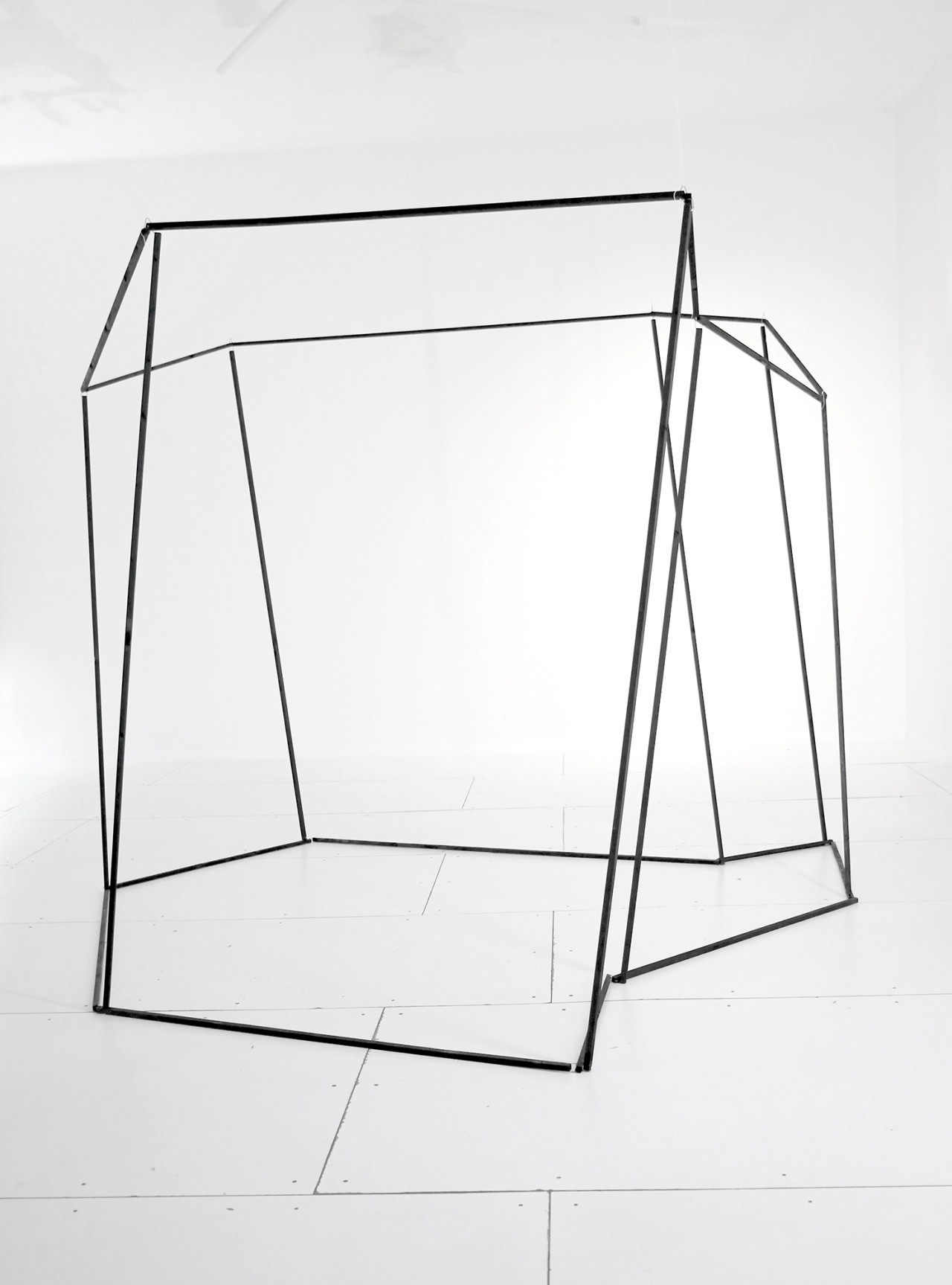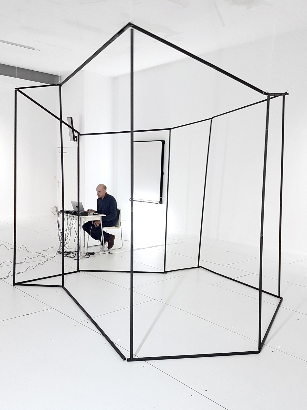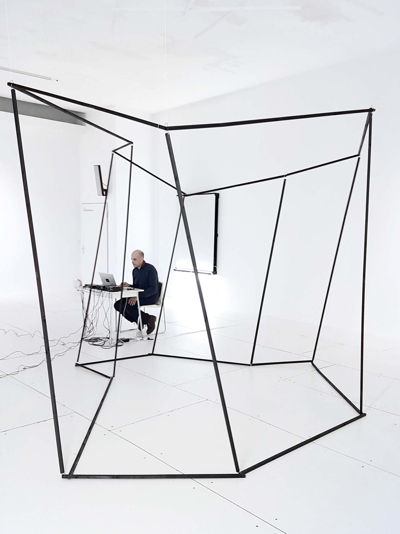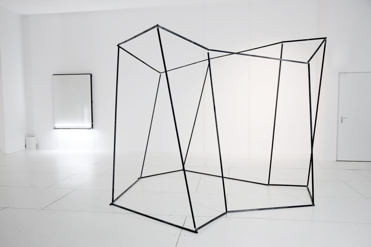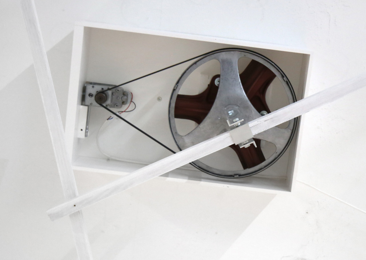 This Installation was part of the soloshow „pure simulation“ at Galerie Bridget Stern, Hamburg Germany // 2018. It shows a constantly changing room in its borders, dimensions and appereance. Wooden sticks, manipulated rotating washing machine motor.