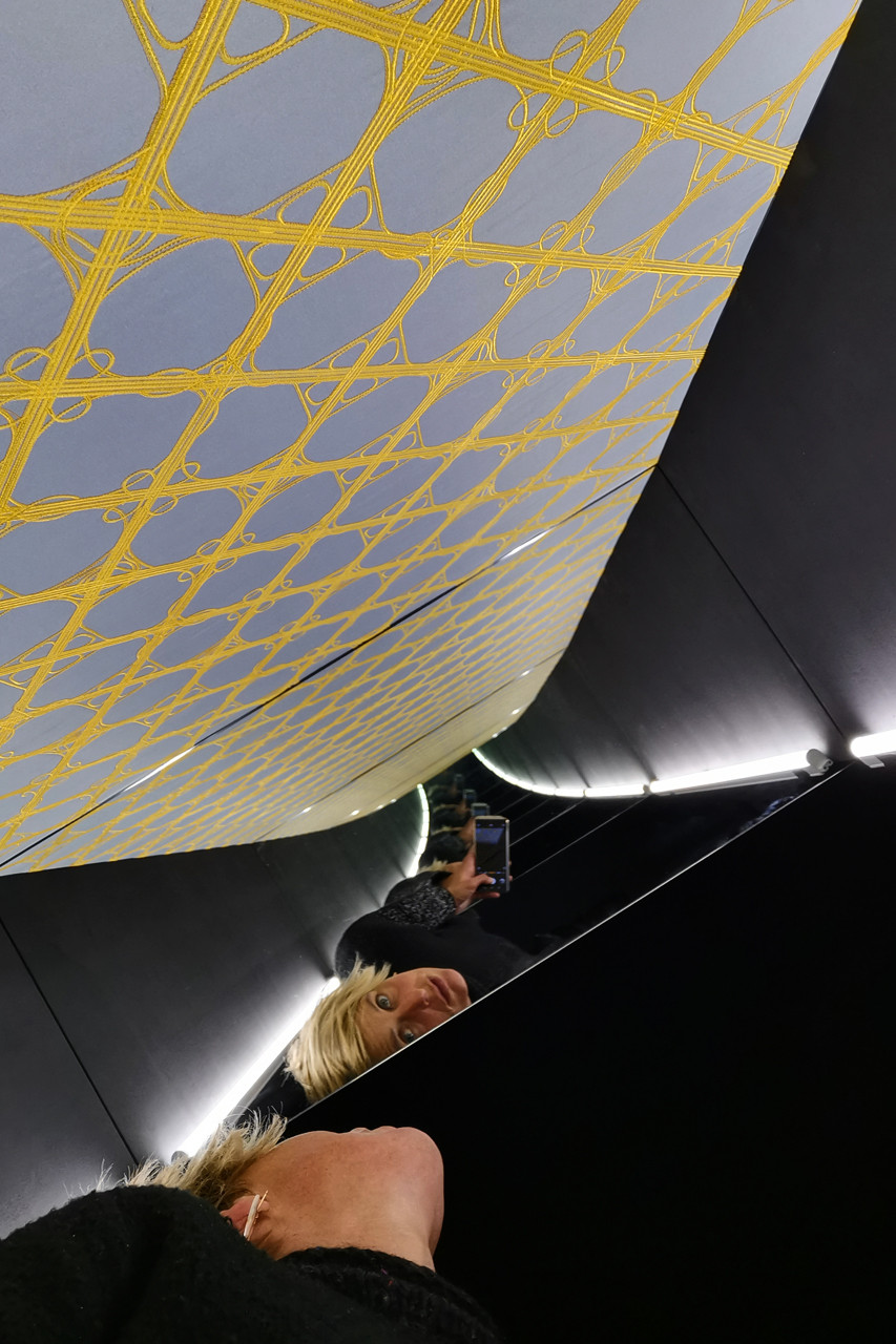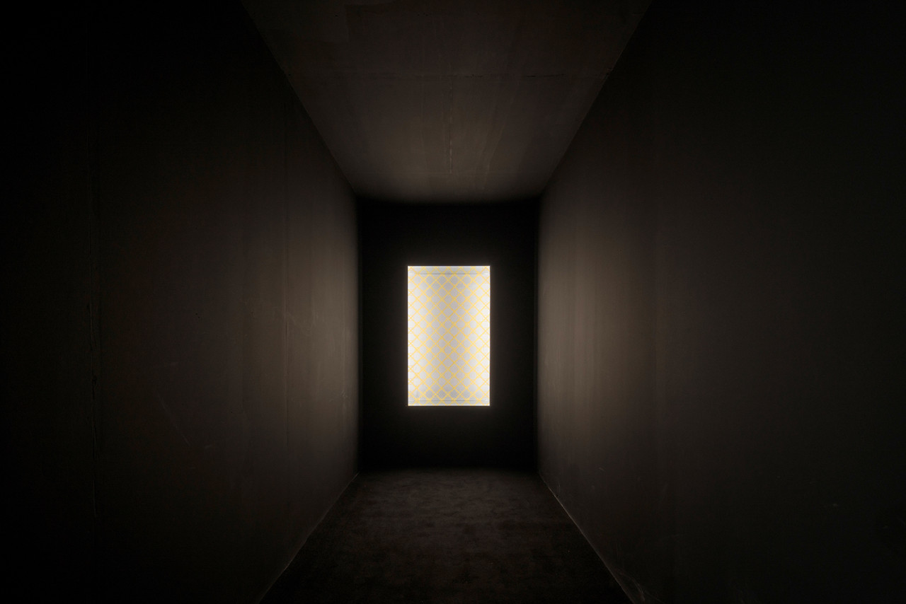 It shows two displays at the end of a black tunnel-like room. At the upper and lower end of both installations, mirrors are attached, that create an „infinity mirror-effect.