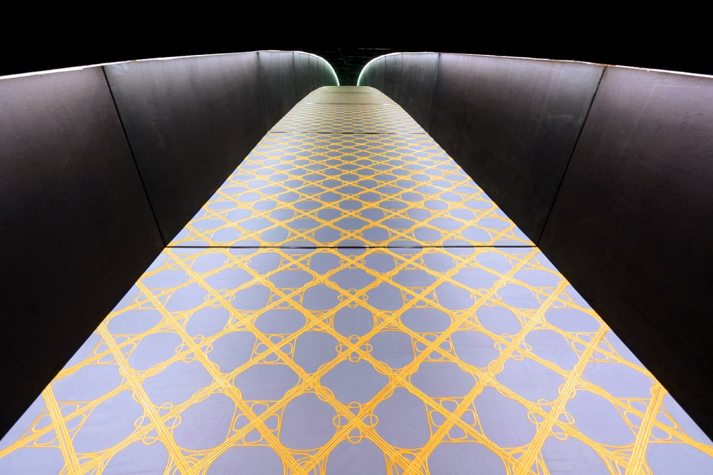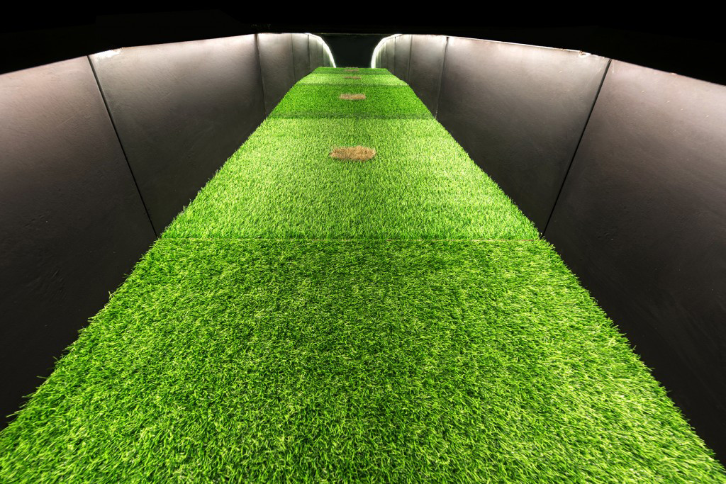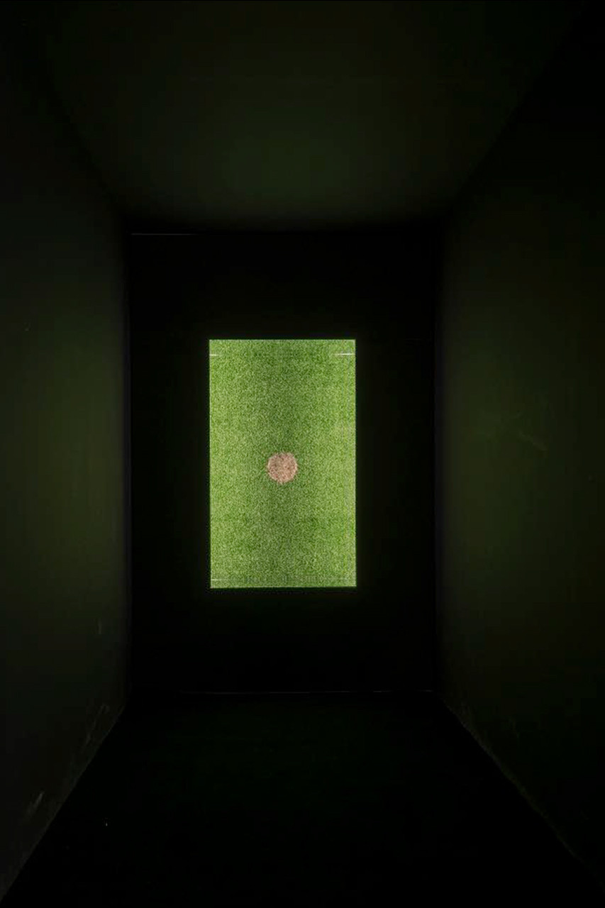 It shows a display at the end of a black tunnel-like room, that is covered with green artificial turf in form of a rectangle, with a circle of natural grass in its center