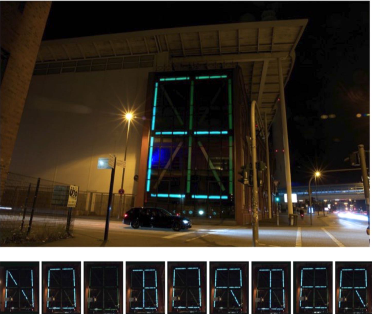 The Installation NO BORDER is showing a huge 14 Segment display that consists of large foils which were coated with glow powder and illuminated with controlled UV light.