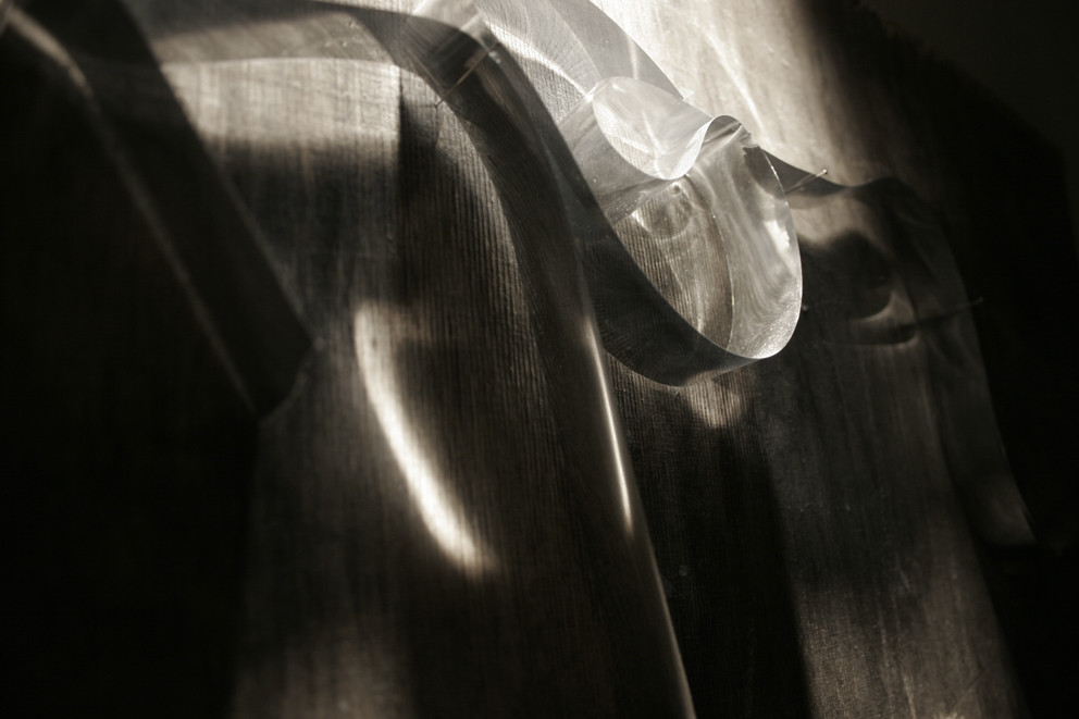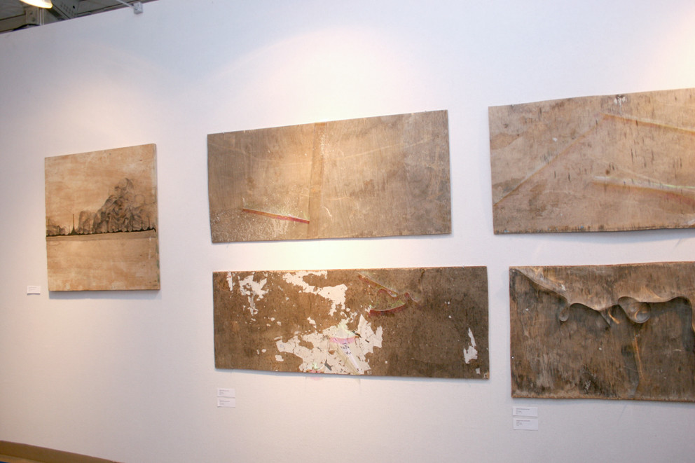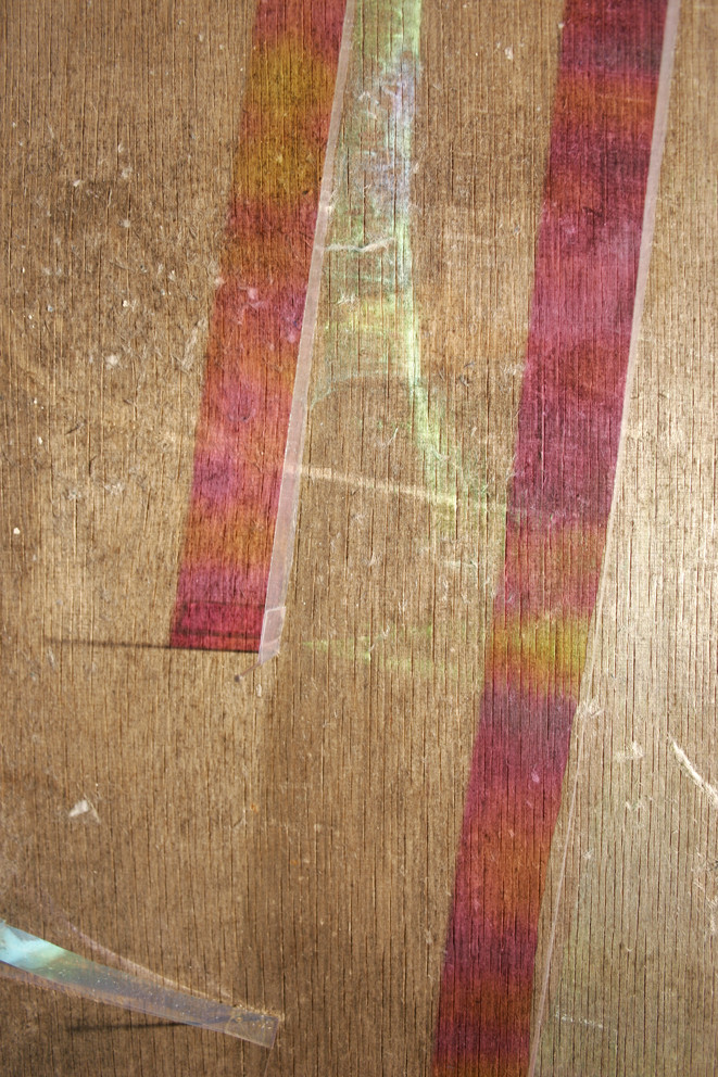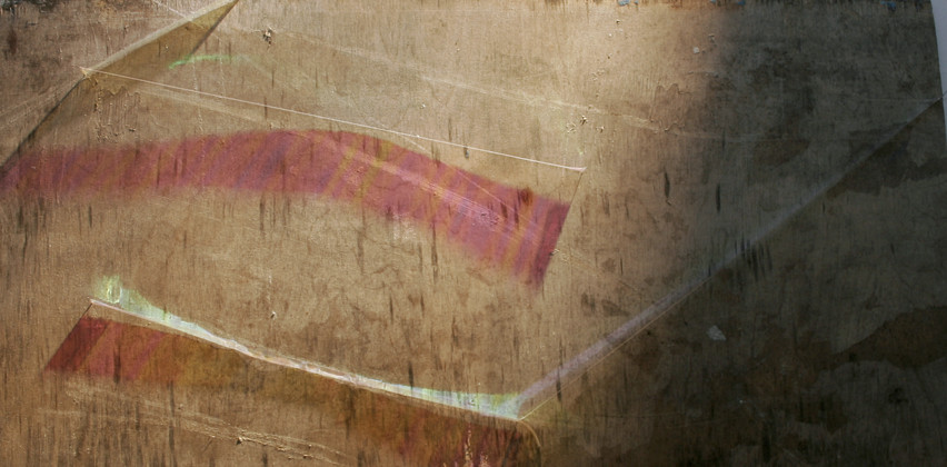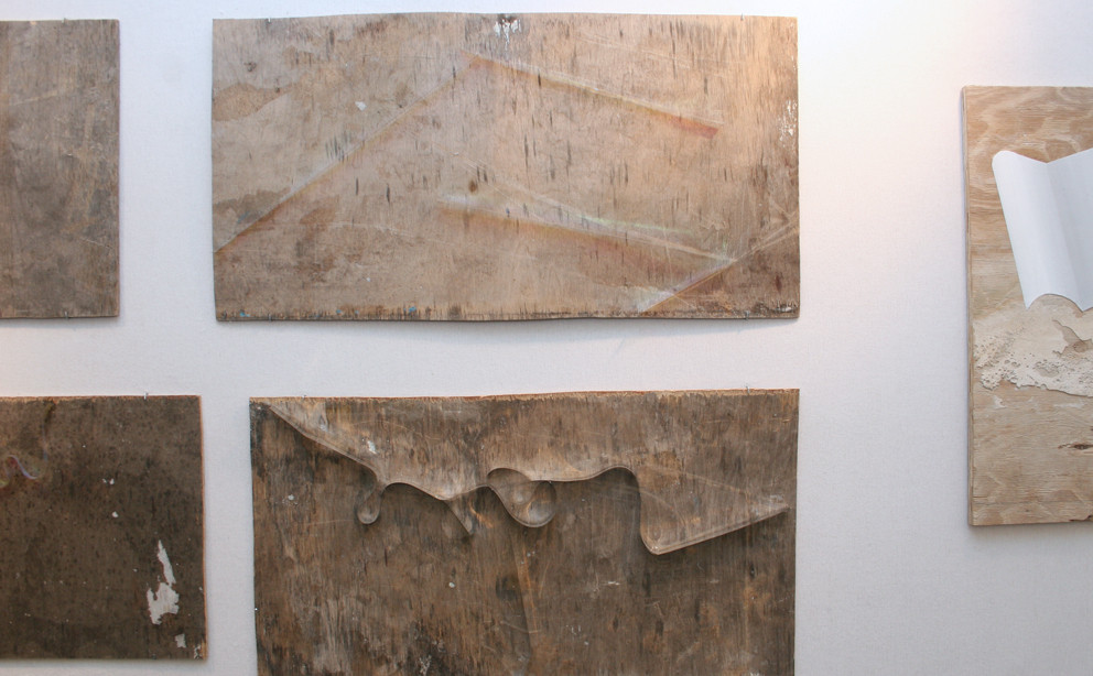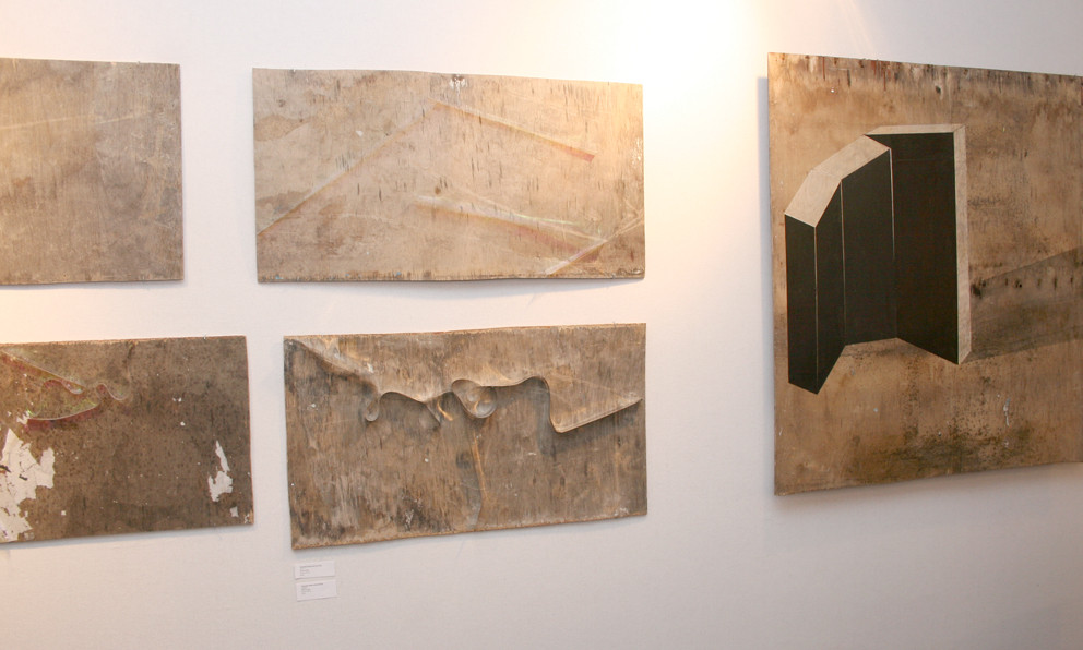 geometrical lightsare flat Installations made of iridescent foils on wooden boards, that change their colours and shapes due to the directions of the spot light. Emerging Artist at Art Fair, Messehallen, Hamburg, Germany, 2015