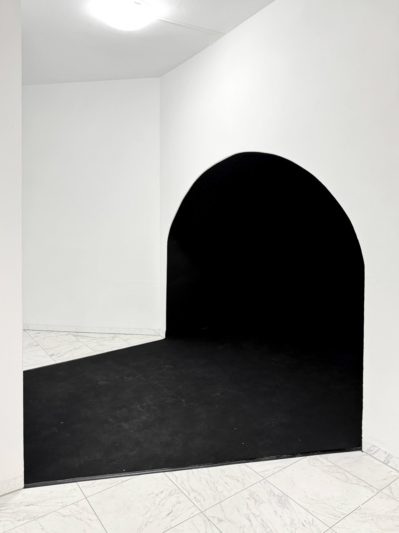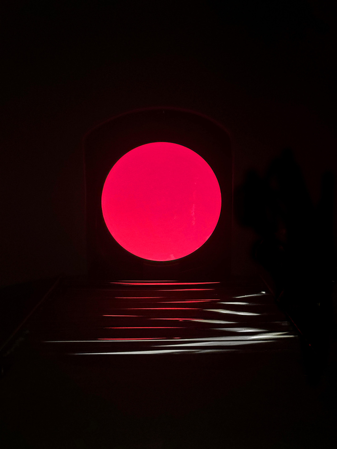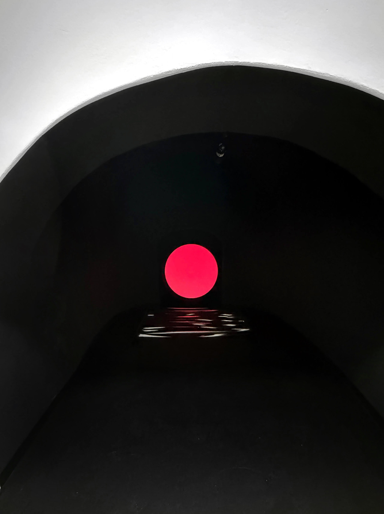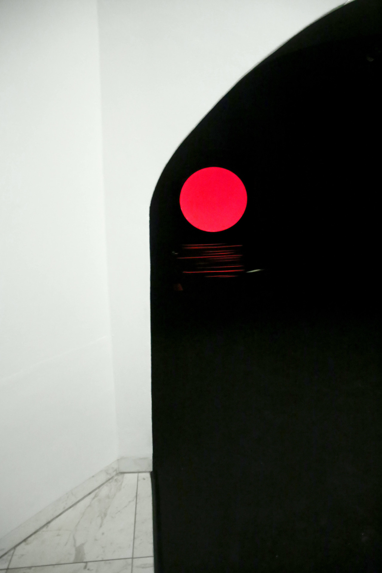In the kinetic installation Horizon, which will be on display at the Museum Schloss Moyland in Germany until the end of 2025, a sunset over the sea is simulated in a vaulted corridor painted in deep matte black. Due to the intense darkness, the visitor is unable to perceive distances and proportions. A pinspot at the end of the tunnel illuminates the sun, and below it, strips of foil are stretched, set in motion by fans. The foil reflects the surrounding light, creating a fake sunset effect.